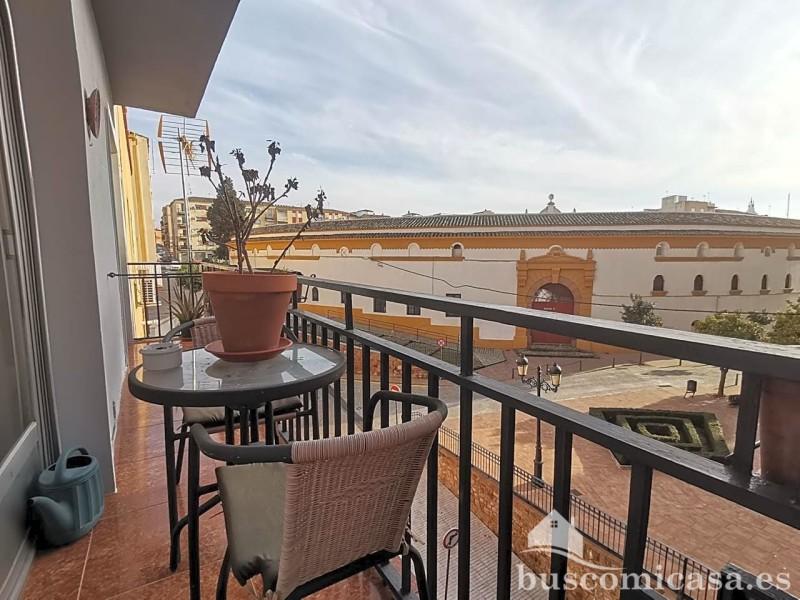 Se trata de una vivienda en muy buen estado que se encuentra en la tercera planta del edificio, sin ascensor, que es muy luminosa y soleada y que consta de cinco dormitorios y dos baños. Al entrar a la vivienda encontramos el dormitorio principal, el cual es muy amplio y exterior puesto que da al gran balcón corrido que tiene el piso. El salón, situado junto al dormitorio principal, es asimismo una estancia muy espaciosa con dos salidas al balcón. Las vistas desde el interior del salón, desde los propios sofás, son magníficas. Una vez salimos, nos encontramos la señorial Plaza de Toros frente a frente. Pasado el salón, encontramos otros dos dormitorios individuales, ambos muy amplios, y uno de ellos con armario empotrado. Junto a este último, hay otro armario empotrado en el pasillo que sirve como despensa. Otro de los dormitorios se encuentra en el otro ala del piso, junto a uno de los cuartos de baño y al último dormitorio, acondicionado como salón-comedor interior. El baño dispone de plato de ducha y de ventana al exterior, por donde obtiene luz natural. El dormitorio, cuyo uso actual es de saloncito, es otra estancia bastante espaciosa con dos ventanas que dan a la terraza interior propia y a los interiores del edificio, y tiene aire con bomba de frío/calor. La cocina está a continuación, amueblada y equipada al completo con todo tipo de electrodomésticos, también lavavajillas, y con agua caliente por termo eléctrico; tiene acceso a la terraza. Esta es espaciosa y tiene amplias ventanas, además de otras dos estancias que son el segundo cuarto de baño con una pequeña bañera, y el lavadero, el cual también tiene ventana.
